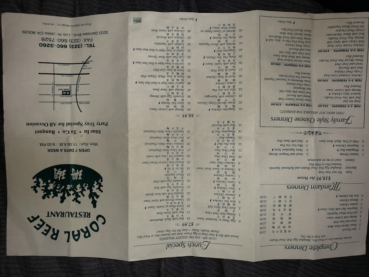 Coral Reef Chinese Restaurant Menu